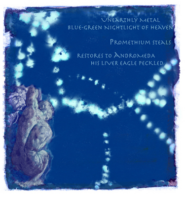 Unearthly metal blue-green nightlight of heaven Promethium steals restores to Andromeda his liver eagle-peckled